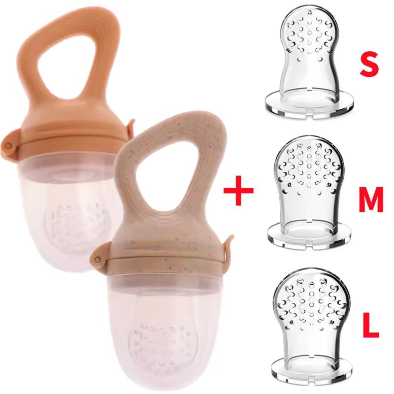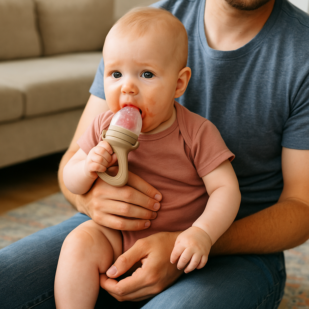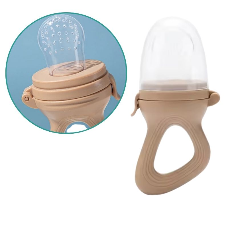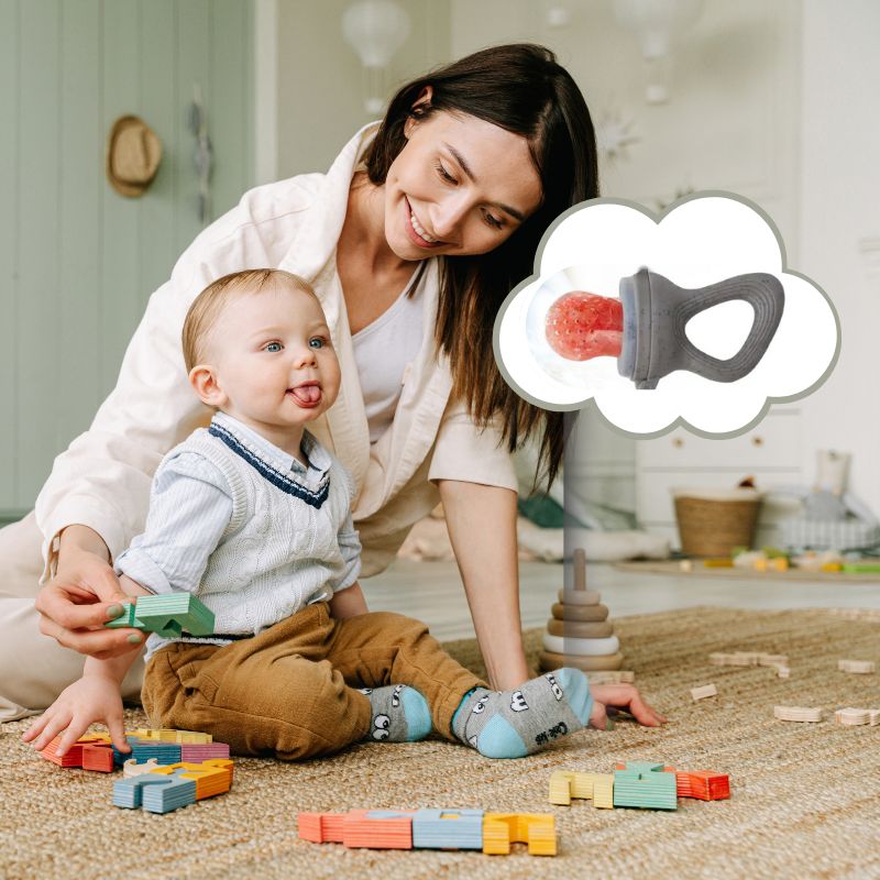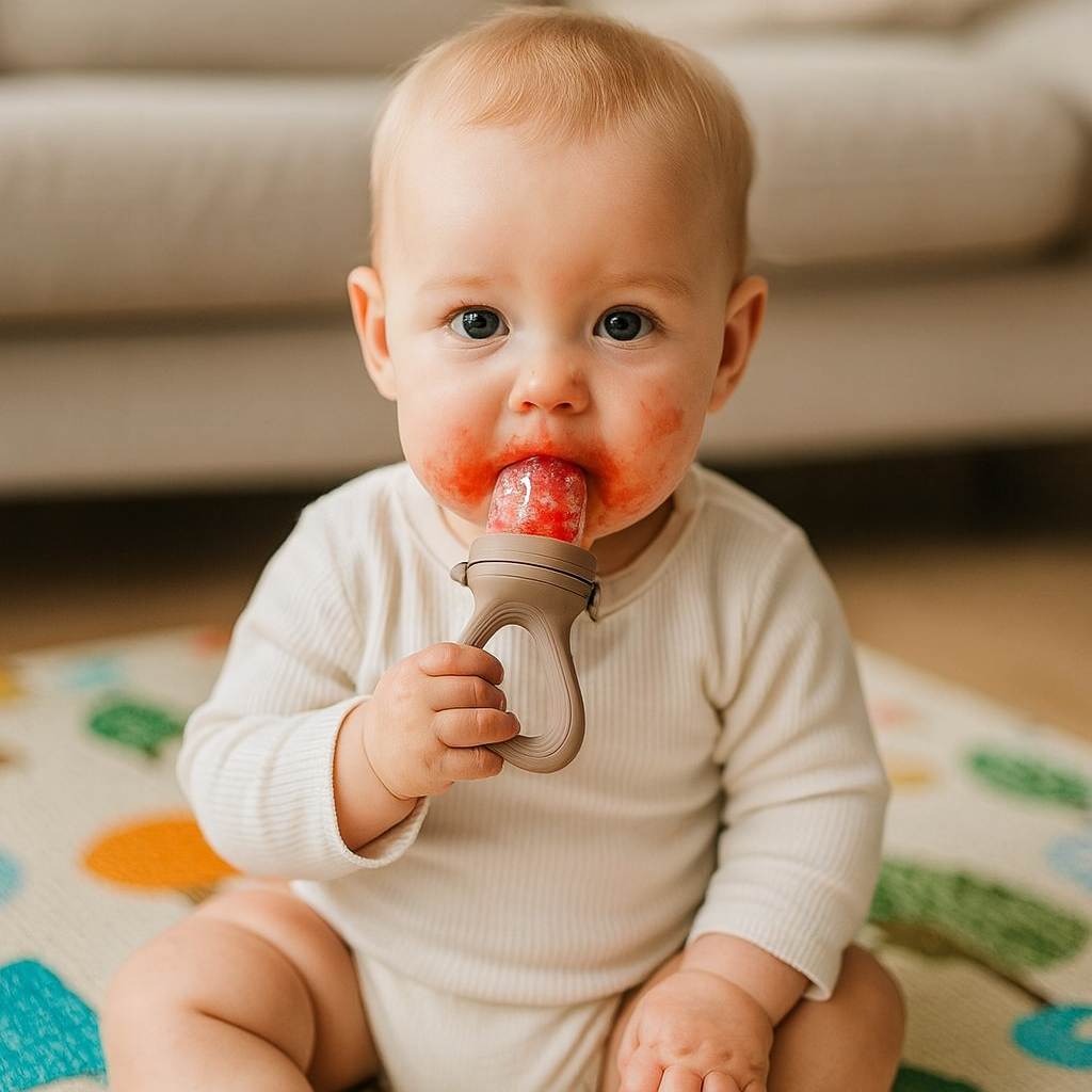 Ses mains attrapent la sucette mangeoire, et dès la première bouchée, un grand sourire illumine son visage. Maman sourit, rassurée : chaque repas devient un moment de découverte et de sécurité.