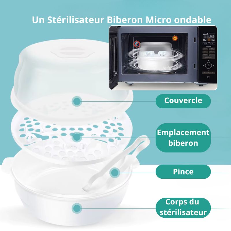 Au micro-ondes : Utiliser un stérilisateur micro-ondes, pratique et rapide (quelques minutes seulement).